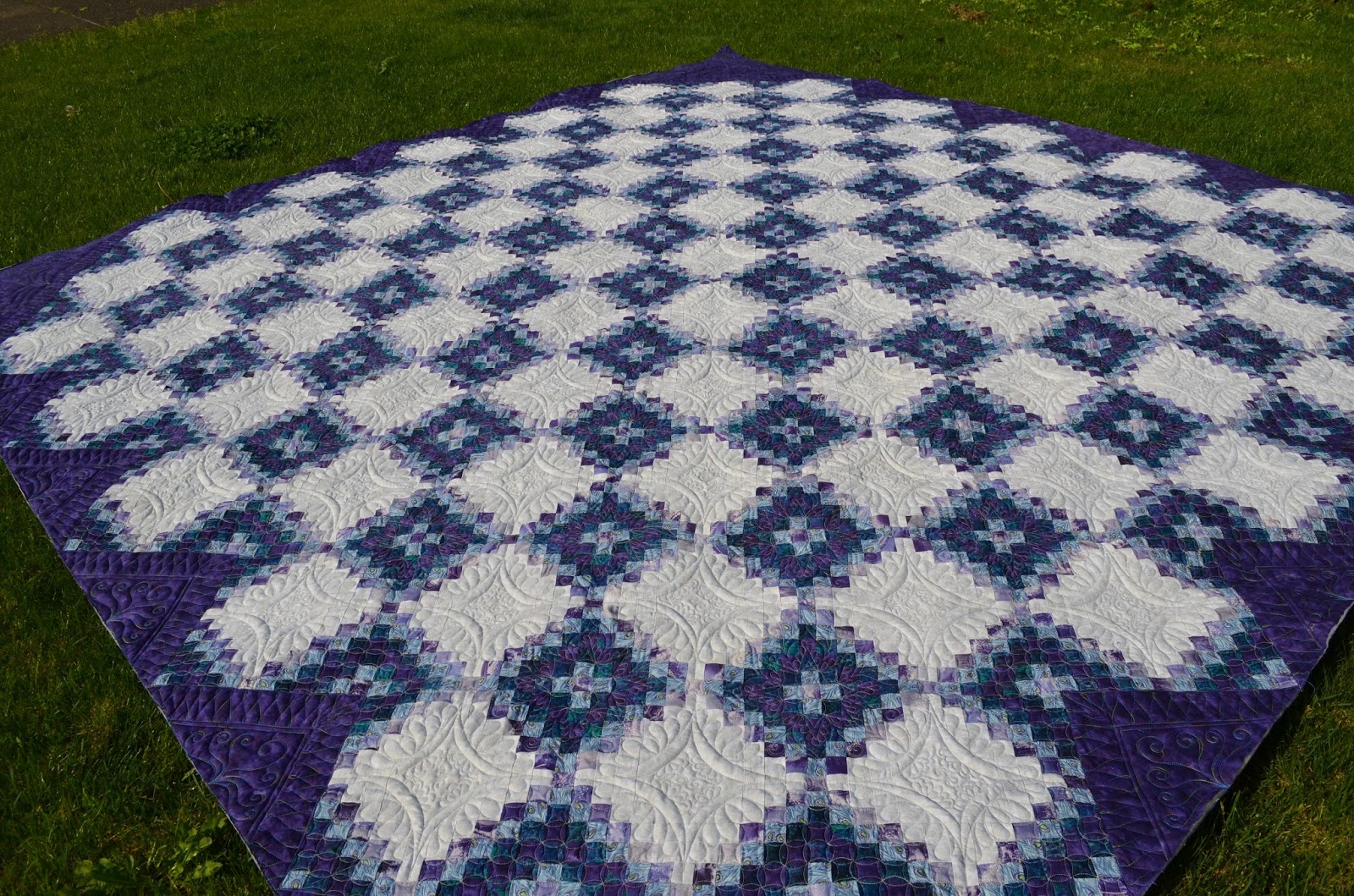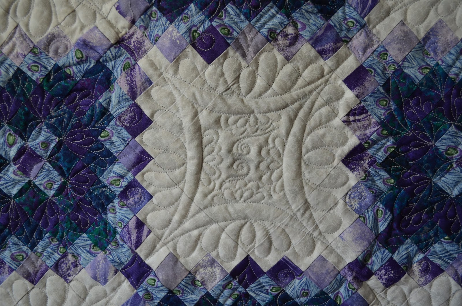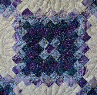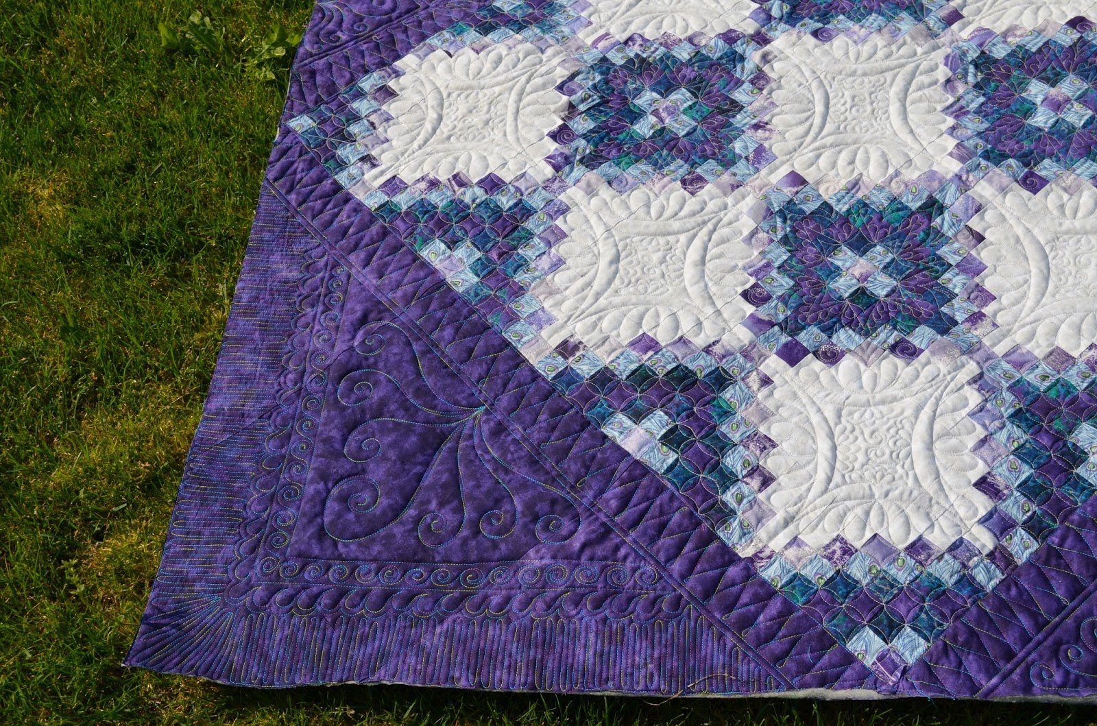 I used a light silver thread on the body of this quilt, as it went well with both the very light grey fabric and the purples and greens in the chains. But I had also gotten this lovely variegated King Tut thread that I knew would really show itself off on those dark purple triangles around the edges of the top. This photo shows how I utilized continuous curve in the partial blocks, and how I divided up the larger purple triangles into different quilting motif’s that echoed some of the elements used throughout the body of the quilt. Isn’t that variegated thread gorgeous and perfect for this quilt’s colorway?