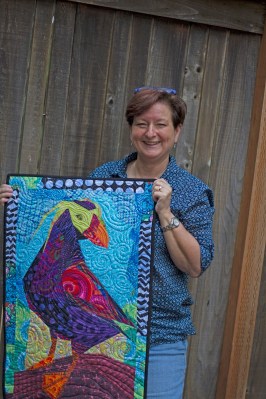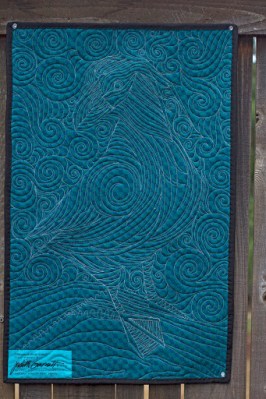 Judith is an awesome artist, and she has a good idea of how she wants her work to look when it’s all done.  To arrive at this end with this project, she brought me some sketches of how she might execute the quilting.  She also encourages me to put my personal spin on her ideas, however.  It’s another way that collaboration results in some truly beautiful finished projects.  This birdie girl was so vibrantly colored, that we chose to use Glide thread, a trilobal polyester which has a brilliant sheen and has the look of Rayon.  I chose to use a grey Magna-Glide-Classic bobbin, so that I could change my top thread color without worrying about having to readjust the tension throughout the project. I’ve recently started using these prewound bobbins because I’ve found that they give great uniform tension and beautiful stitch quality.
